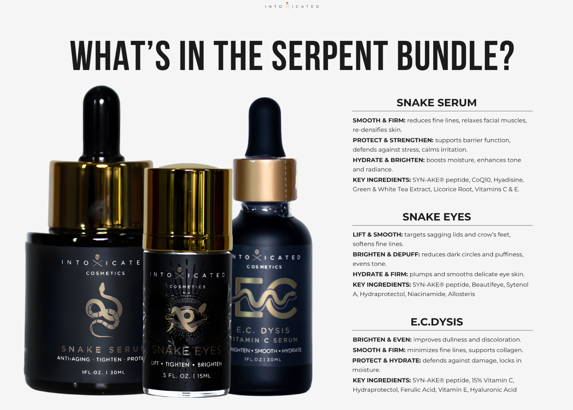 Snake Serum: water, propanediol, glycerin, niacinamide, trehalose, betaine, pentylene glycol, caesalpinia spinosa fruit pod extract / caesalpinia spinosa fruit extract, centella asiatica extract, dipeptide diaminobutyroyl benzylamide diacetate,, phytol, ubiquinone, ascorbyl tetraisopalmitate, alpha tocopherol, sodium hyaluronate, palmitoyl tripeptide-1, palmitoyl tetrapeptide-7, helianthus annuus (sunflower) sprout extract, lecithin, camellia sinensis leaf extract, maltodextrin, syringa vulgaris (lilac) extract, glycine soja (soybean) seed extract, ascorbyl palmitate, camellia oleifera leaf extract, tocopherol, glycyrrhiza glabra (licorice) root extract, ascorbic acid, echinacea purpurea extract, xanthan gum, isomalt, vegetable oil, polysorbate 20, phenoxyethanol, caprylyl glycol, butylene glycol, ethylhexylglycerin, hexylene glycol, disodium EDTA, sodium hydroxide, PEG-8, citric acid, sodium acrylate/acrylonitrogens copolymer, natural fragrance, pseudoalteromonas exopolysaccharides.